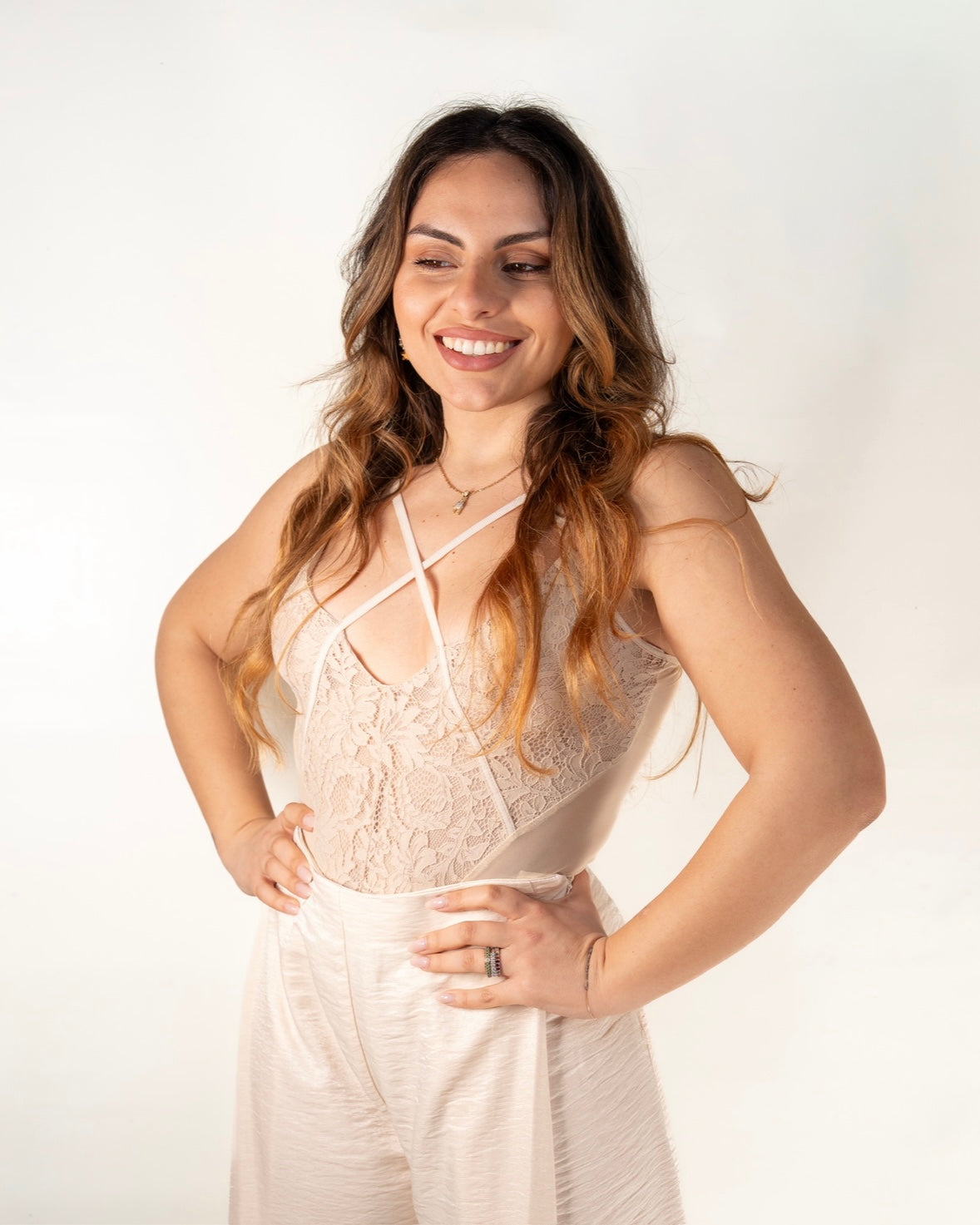 Il Body Intreccio Burro presenta una raffinata combinazione di pizzo e trasparenze, caratterizzato da un incrocio elegante sul davanti. Questa struttura non solo evidenzia la silhouette, ma offre anche un comfort ottimale, rendendo il capo versatile per diverse occasioni. Ideale per chi cerca un equilibrio tra stile e funzionalità.