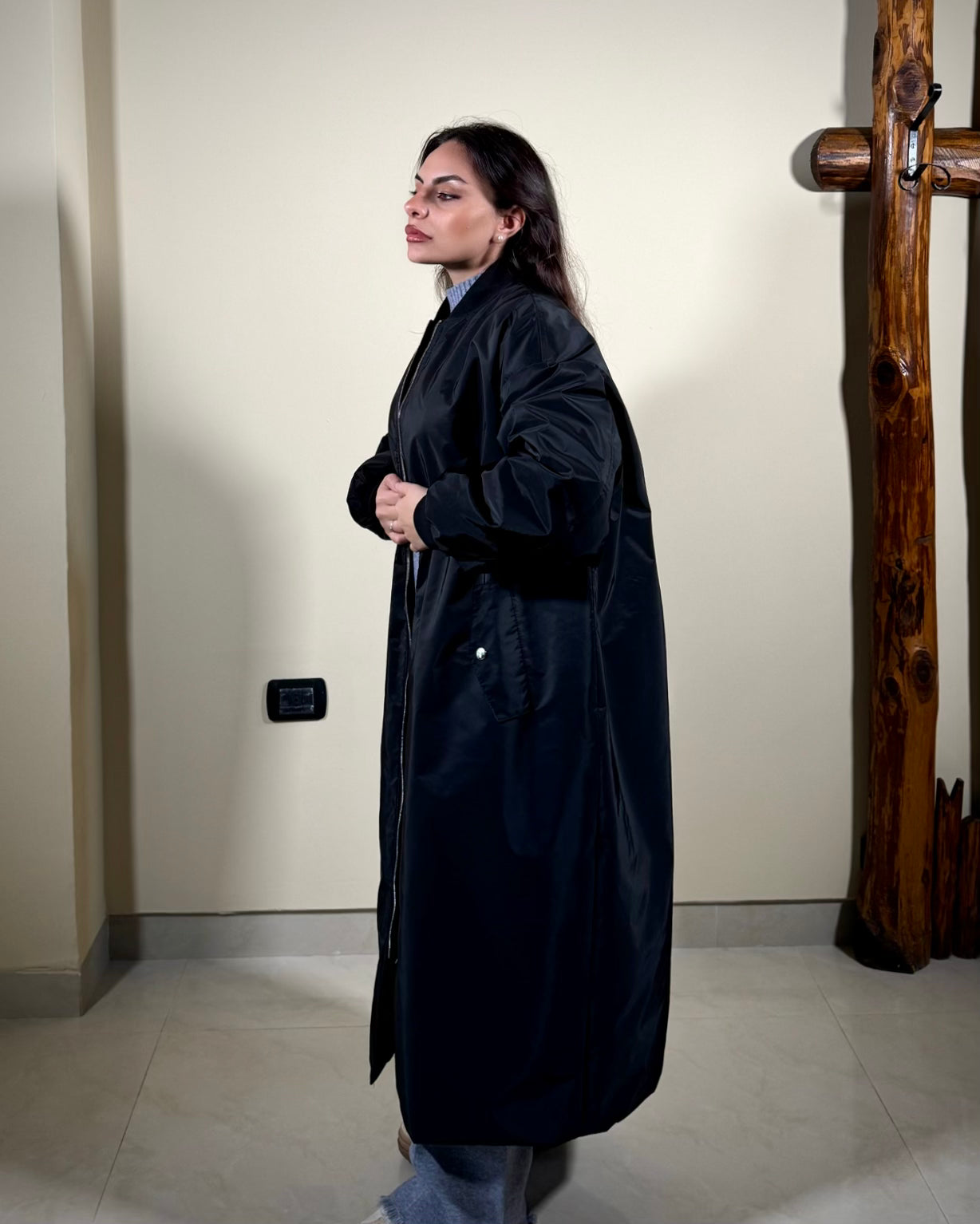 Bomber lungo in nero con polsini elasticizzati e cerniera frontale. Silhouette versatile che si presta a molteplici combinazioni: perfetto abbinato a maglieria coordinata e accessori sportivi per uno stile casual e confortevole. La lunghezza estesa offre una copertura generosa, ideale per chi ricerca praticità senza compromessi stilistici. Un capo essenziale per il guardaroba contemporaneo.