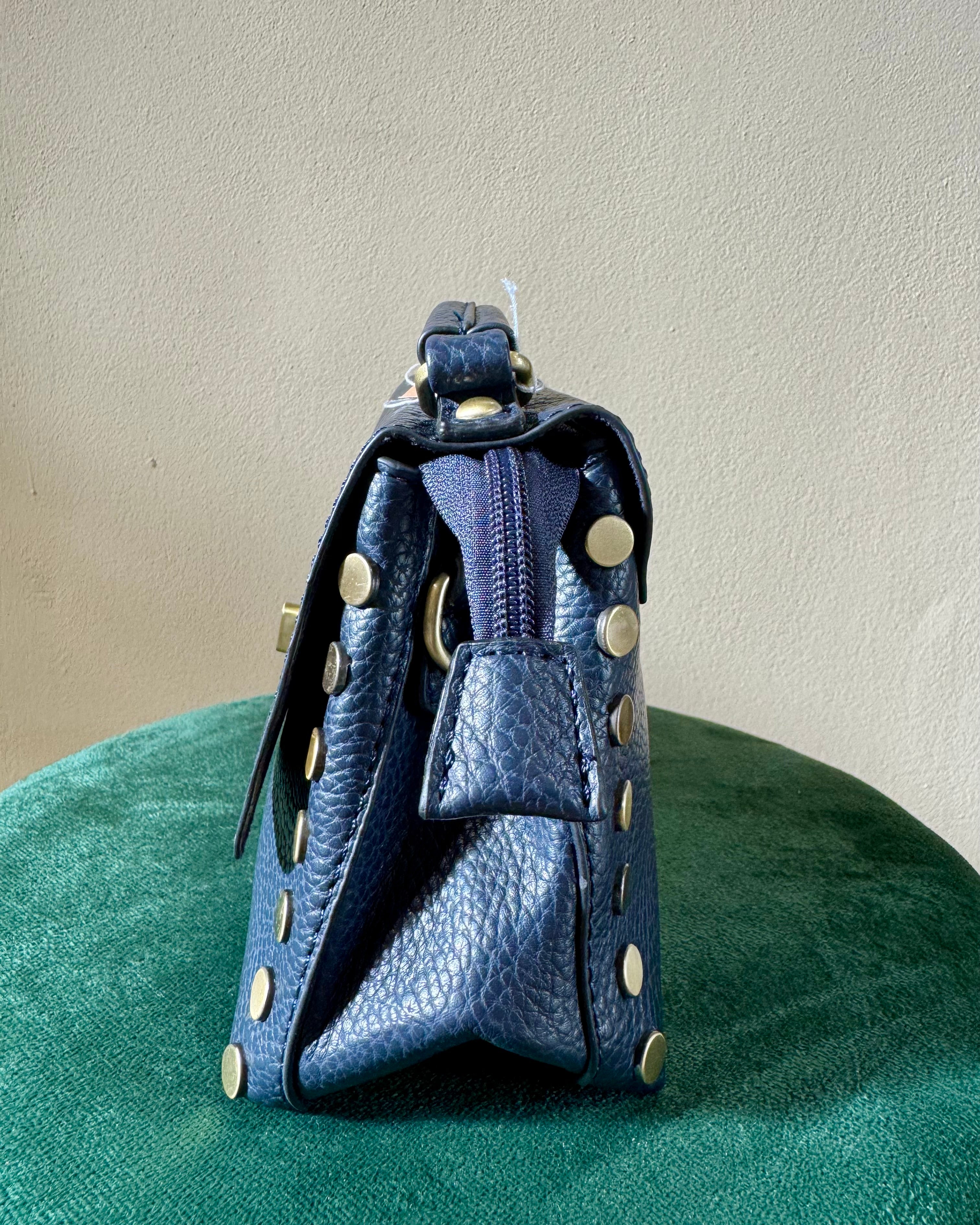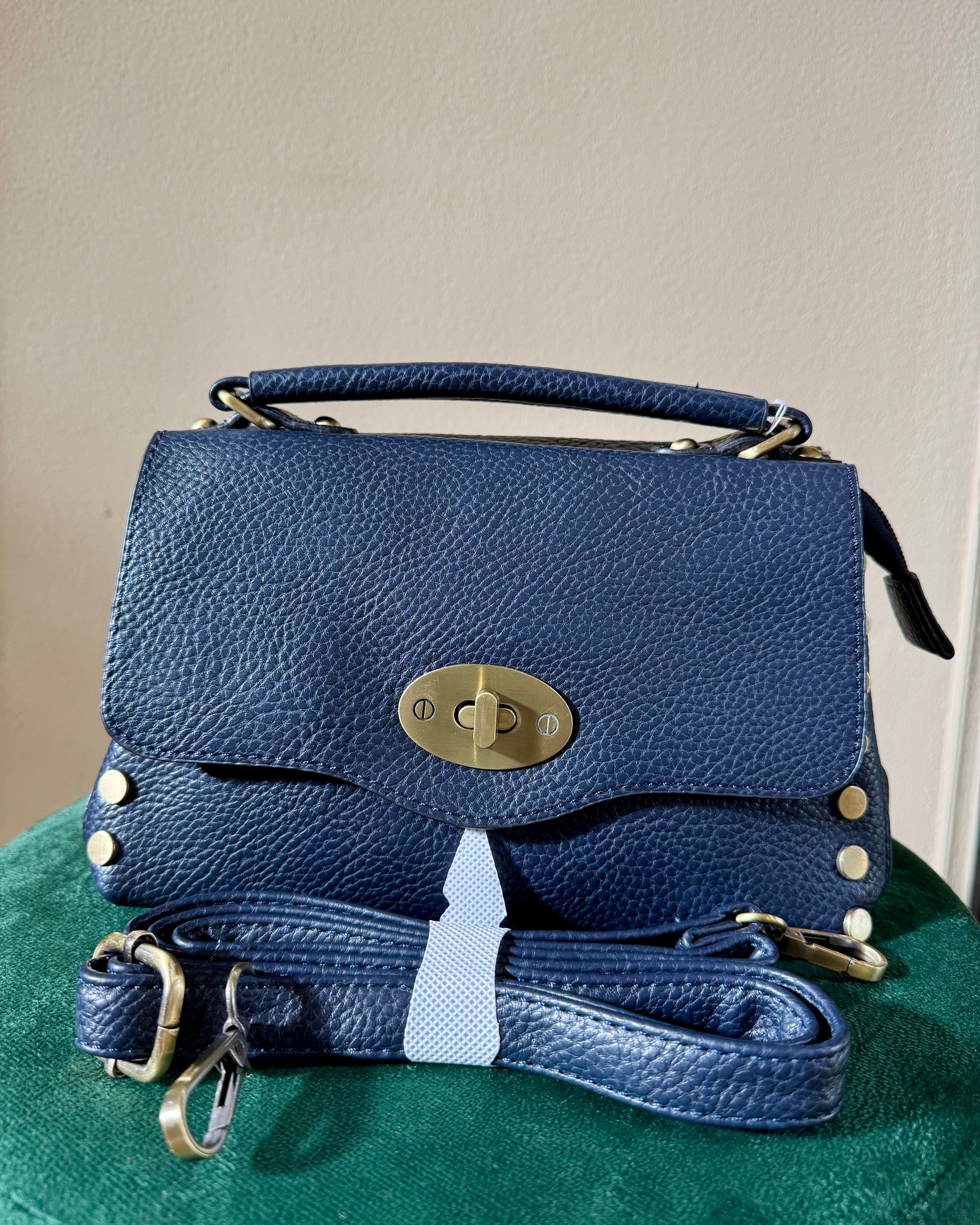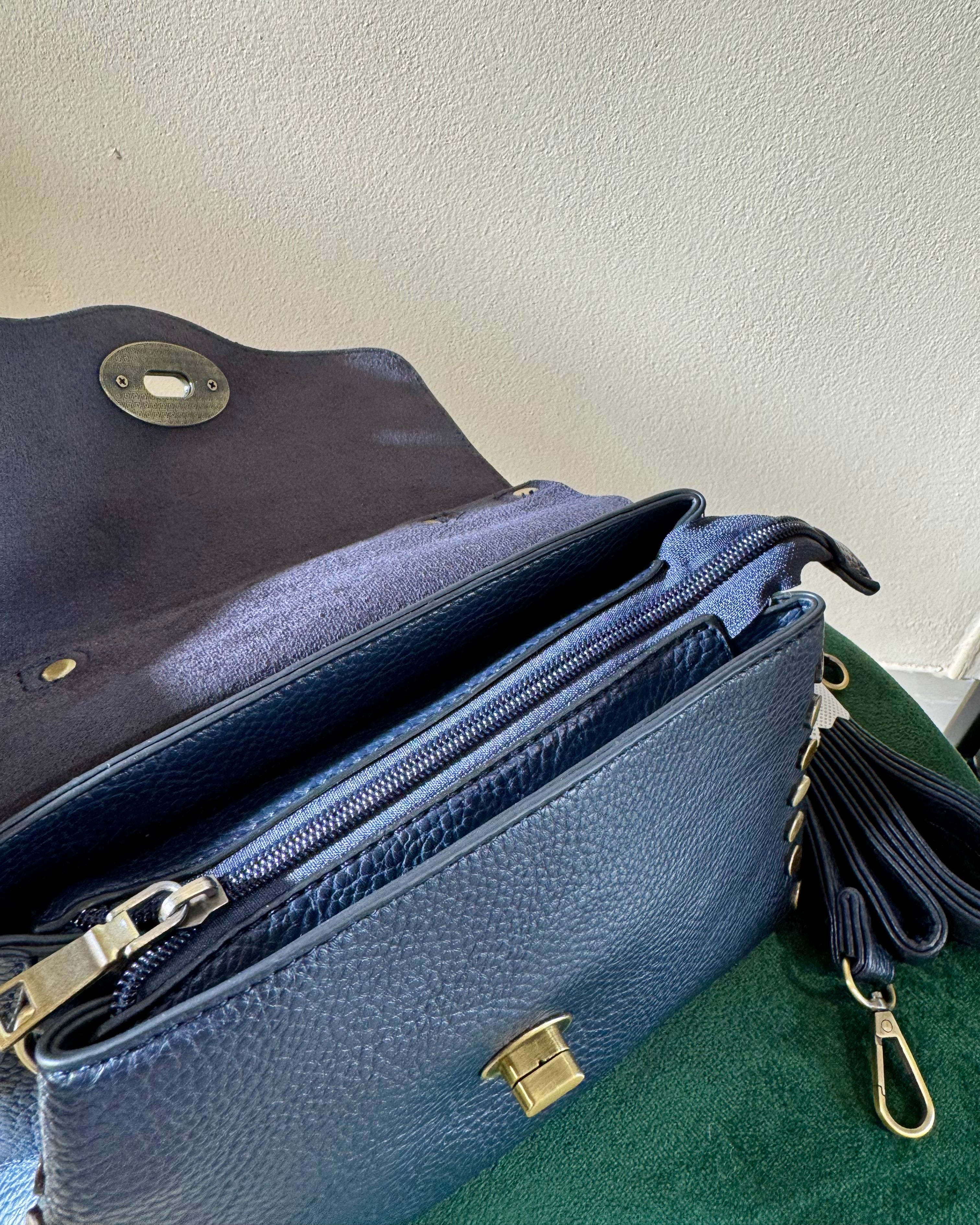 La Borsa Blu Navy è un connubio perfetto tra eleganza e modernità. Realizzata in ecopelle con texture martellata, presenta un manico e una tracolla per indossarla comodamente, ed è arricchita da hardware in ottone anticato e borchie decorative sui lati. Ideale per un look grintoso e alla moda.