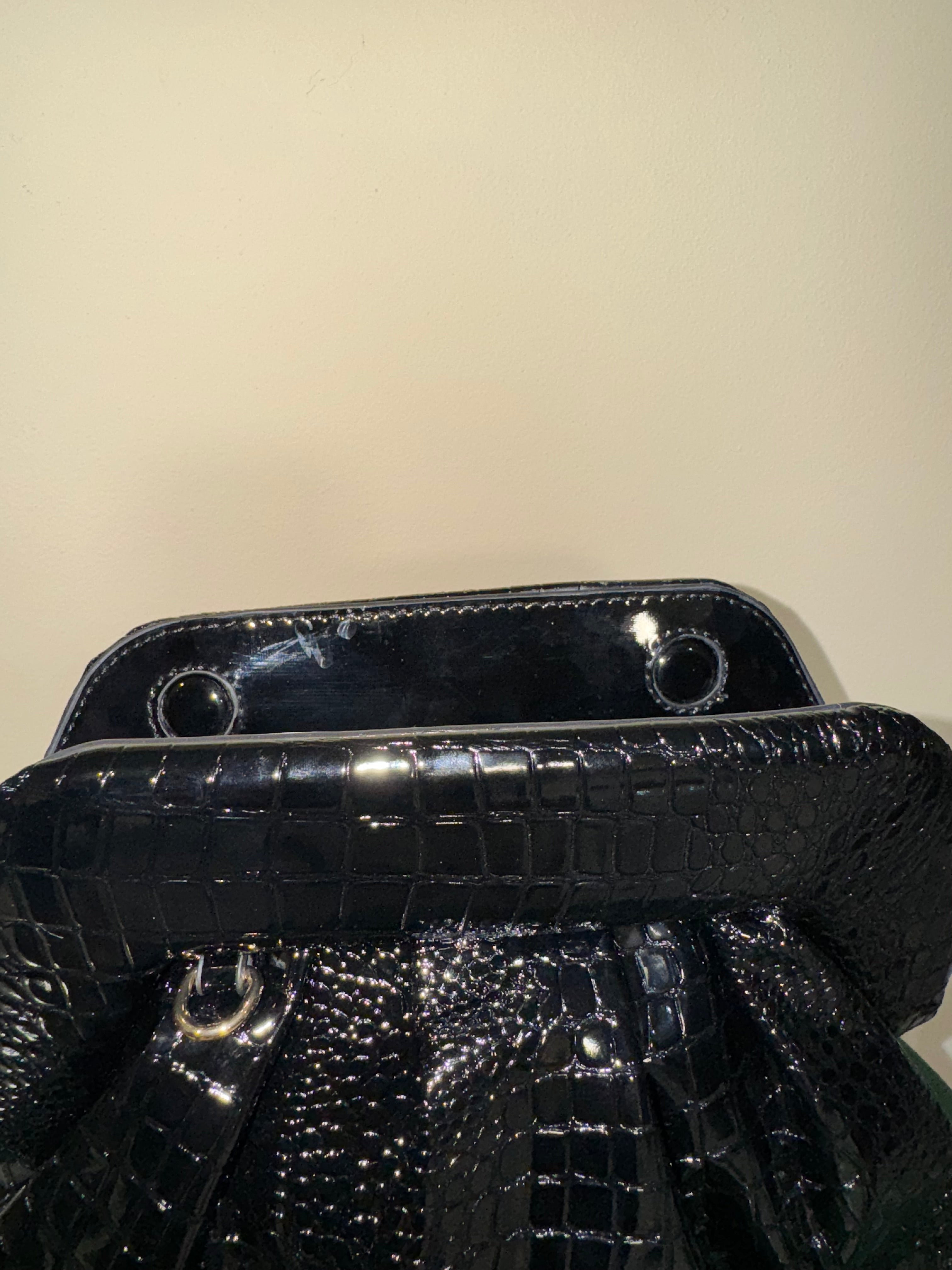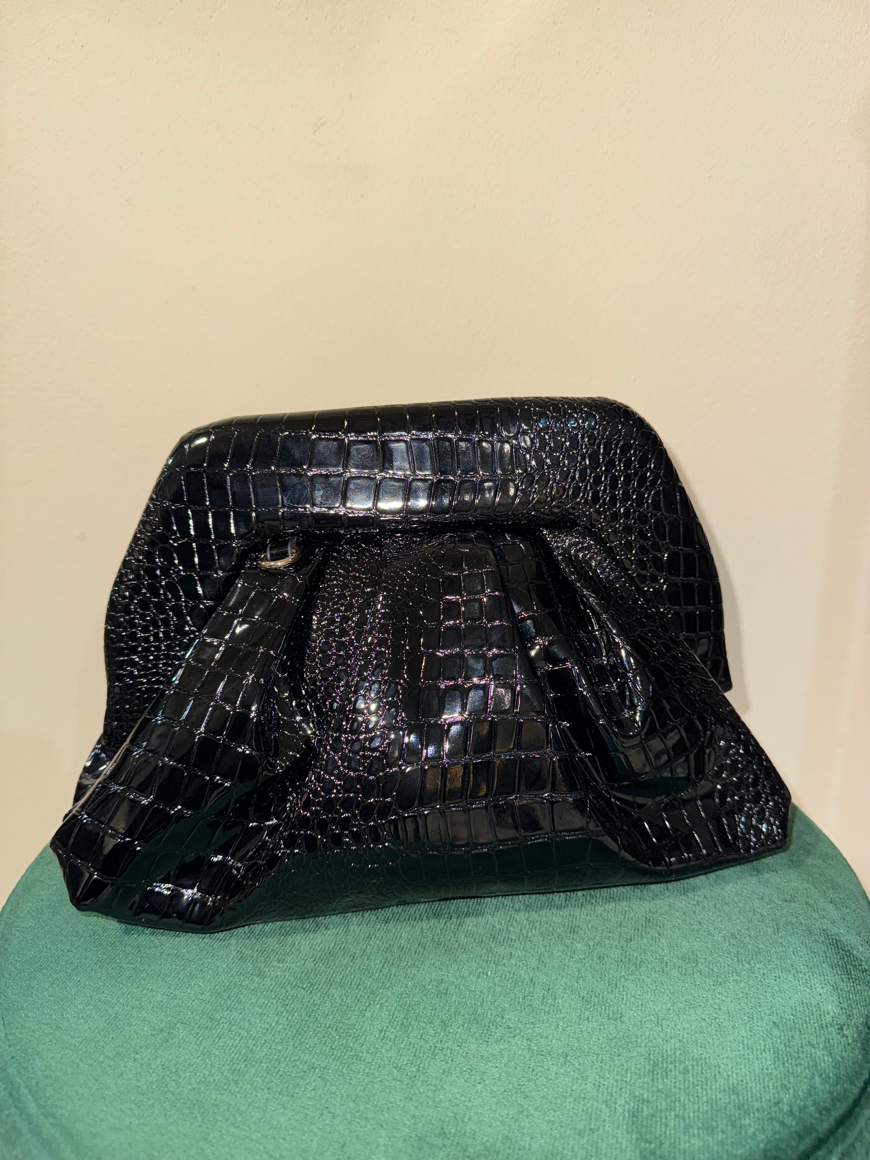 Questa elegante borsa in similpelle verniciata lucida nera è perfetta per qualsiasi occasione. La stampa cocco e la chiusura magnetica la rendono unica, mentre la catenella color oro lucida ti permette di portarla comodamente come una clutch. Aggiungi un tocco di stile al tuo outfit con questa borsa versatile e di alta qualità.