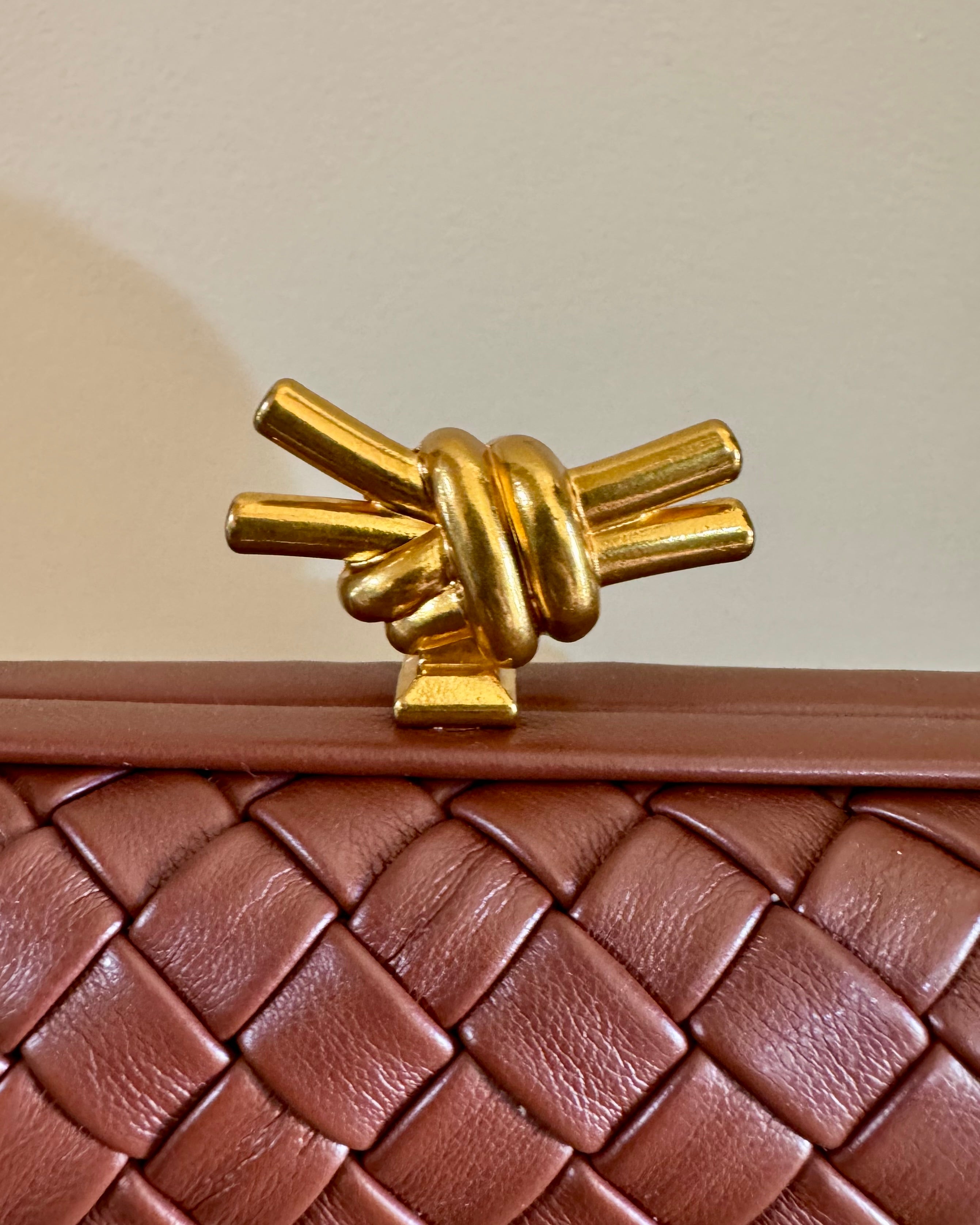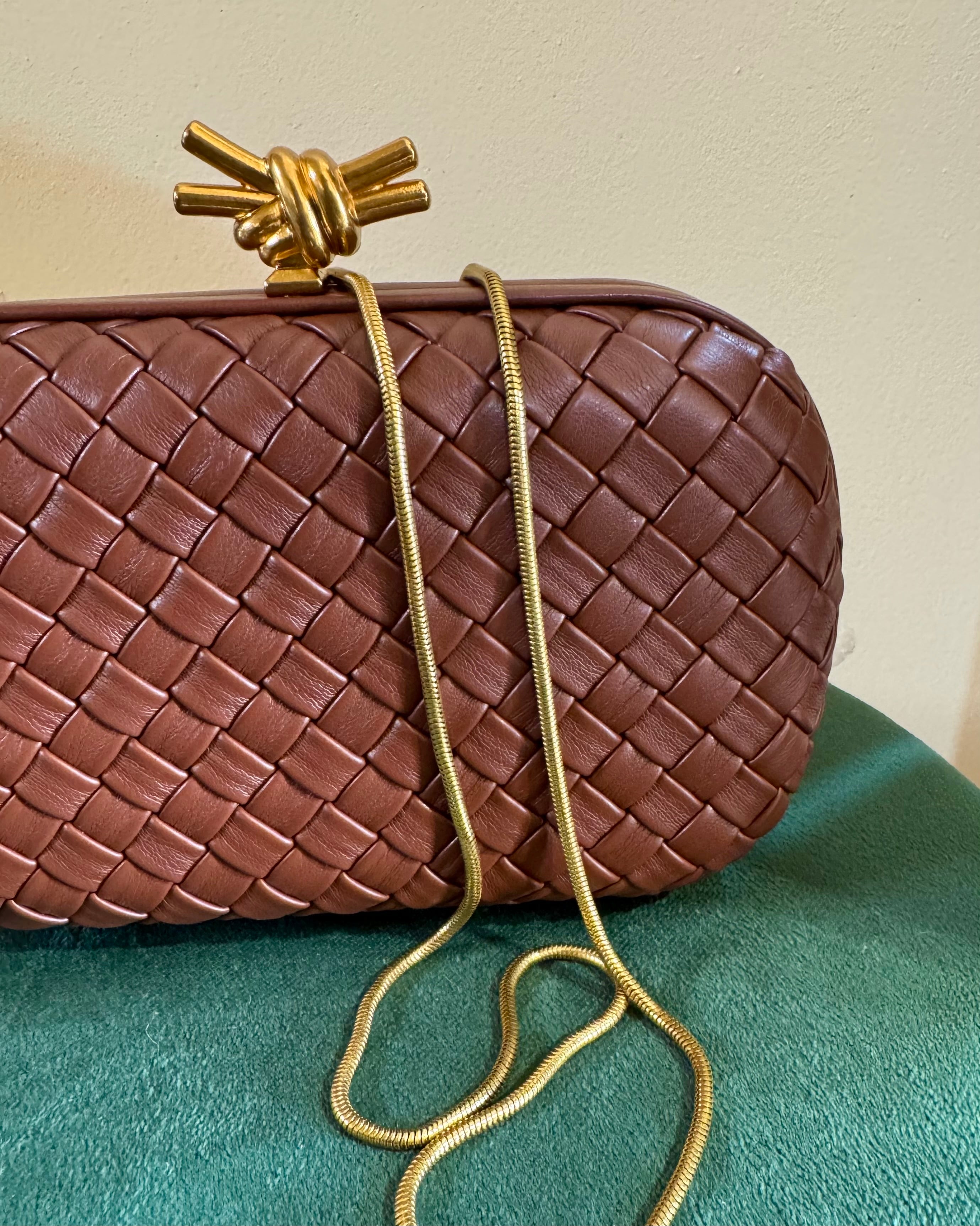Questa bellissima Borsa Clutch Intreccio è un accessorio elegante e versatile. Caratterizzata da una lavorazione intrecciata di colore marrone rossiccio, questa borsa rigida è dotata di una chiusura a nodo e di una comoda tracollina. Perfetta per completare ogni look con stile e raffinatezza.