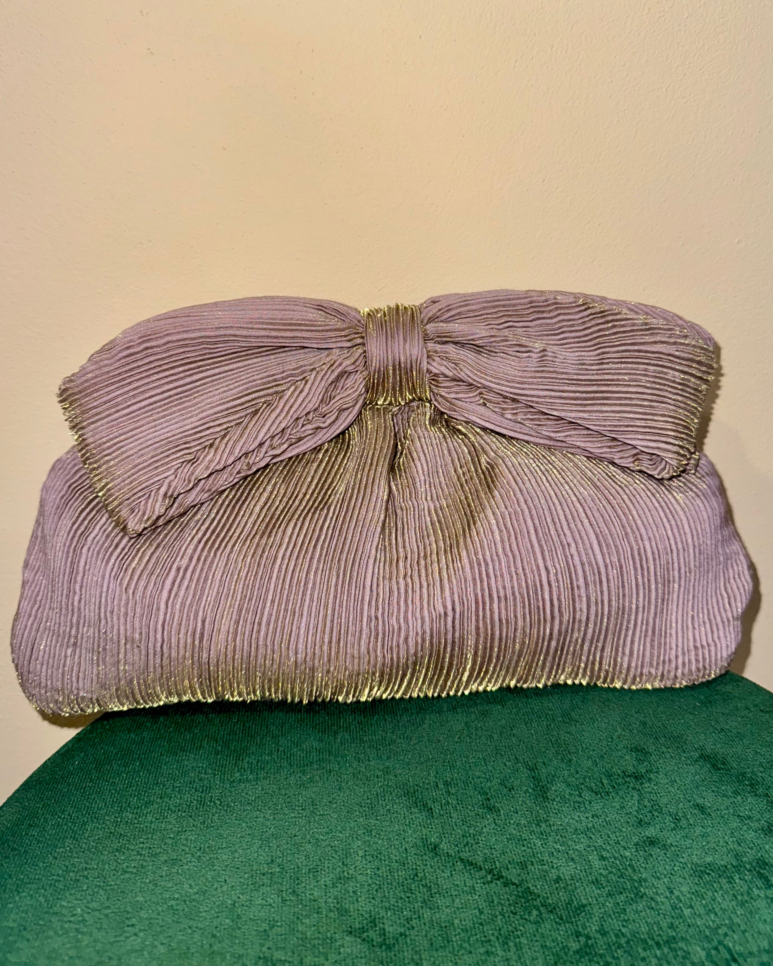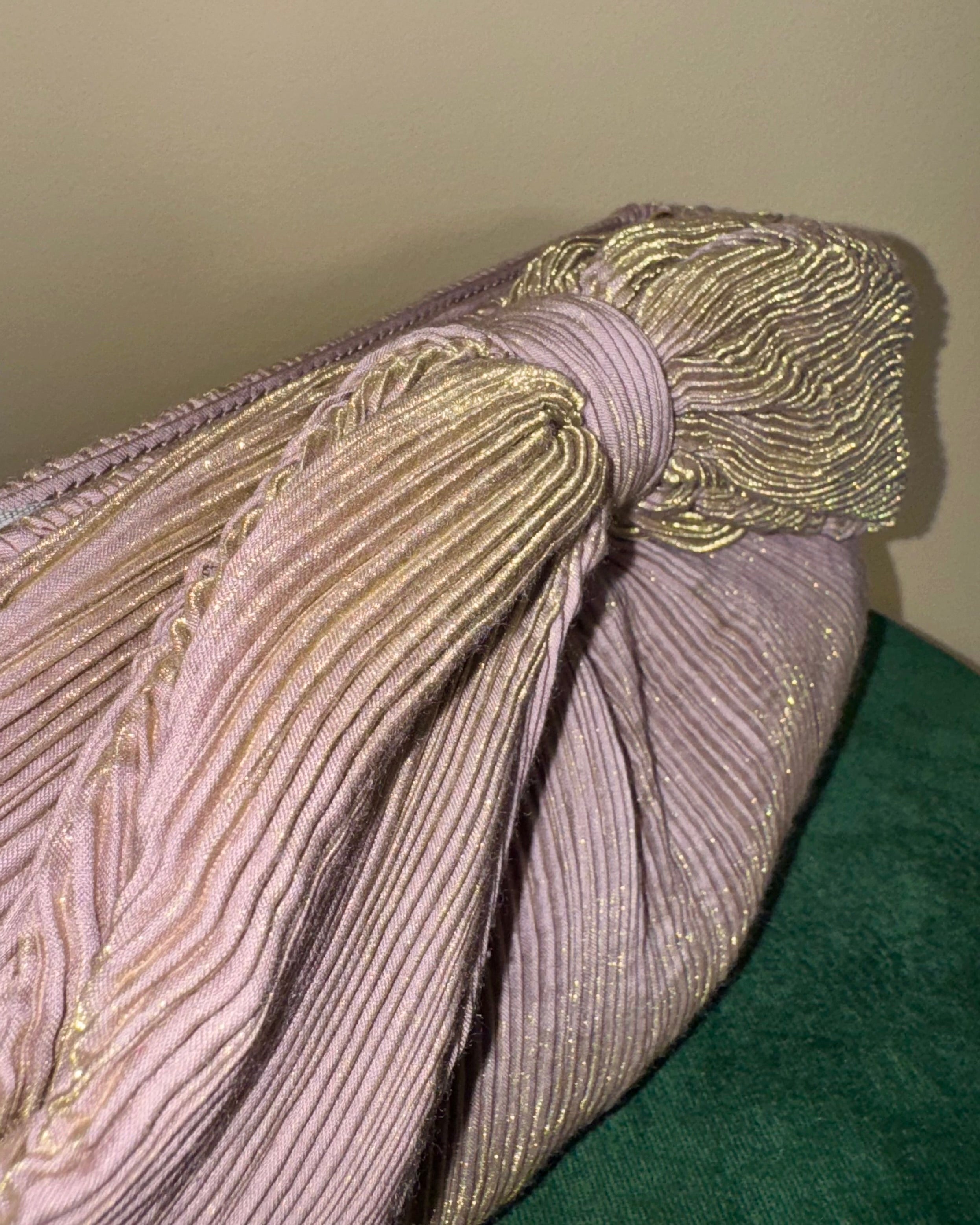 Borsa Fiocco: Una clutch elegante con pieghe fitte plissé che creano un effetto cangiante grazie ai fili dorati. Presenta una catenella oro come tracolla. Il grande fiocco centrale in tessuto aggiunge un tocco di stile. Perfetta per serate speciali.