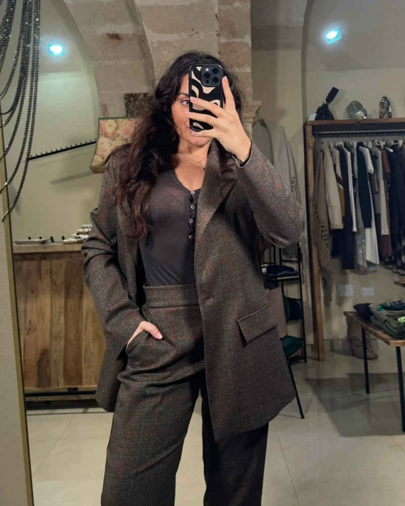 Questa giacca tailleur con fantasia quadri e scollo a V è perfetta per dare un tocco di colore al tuo guardaroba. Lunga e slanciata, si abbina al suo pantalone coordinato nei toni coccio moro, per un look elegante e coordinato. La scelta ideale per un'occasione formale o un'uscita in città.