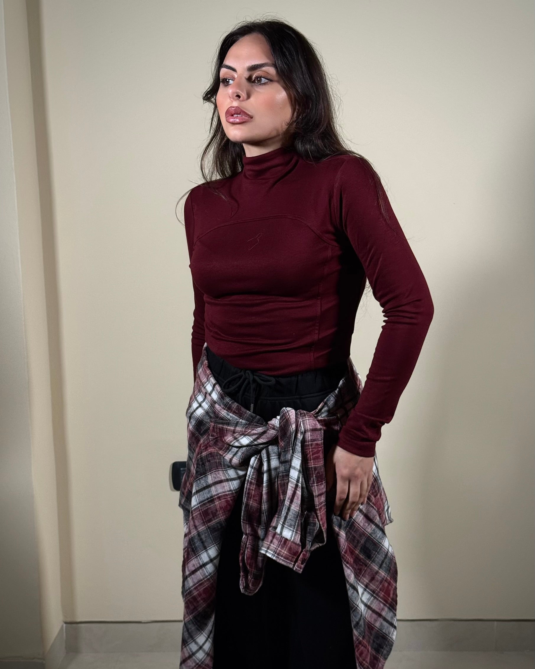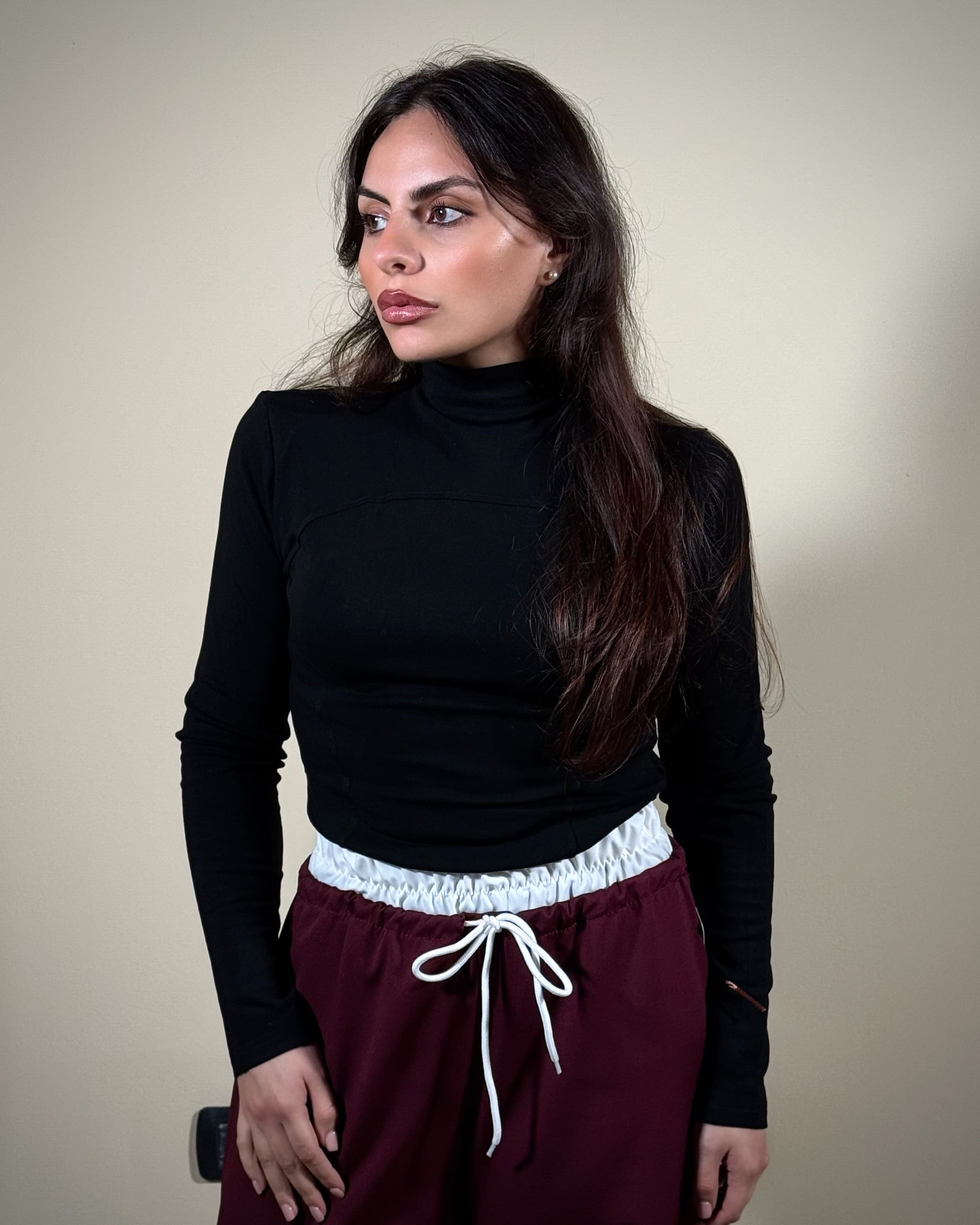 Maglia collo alto manica lunga aderente perfetta con tuta o come sotto giacca o sotto una camicia o maglione. È abbastanza calda dentro felpata