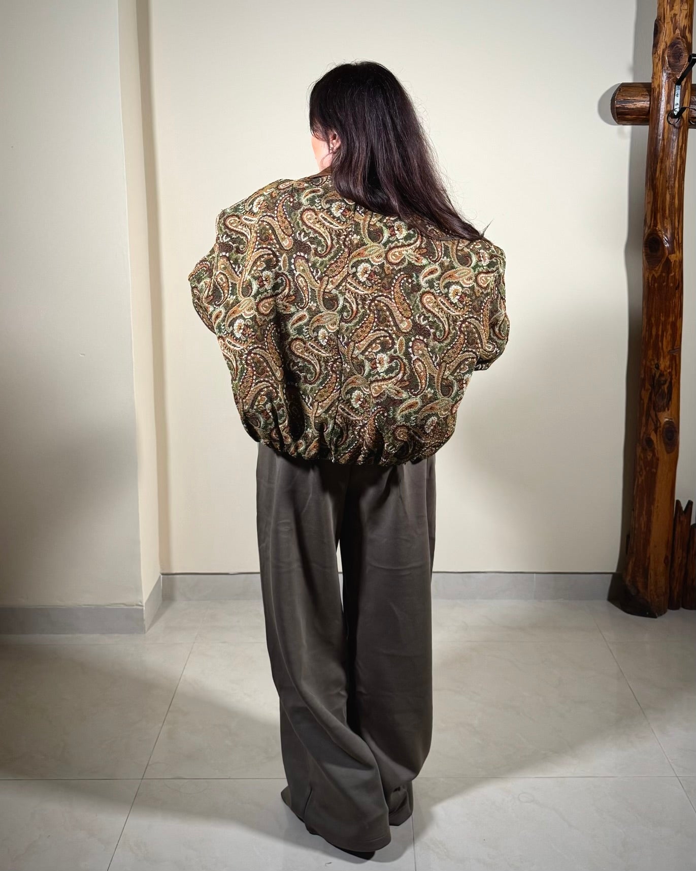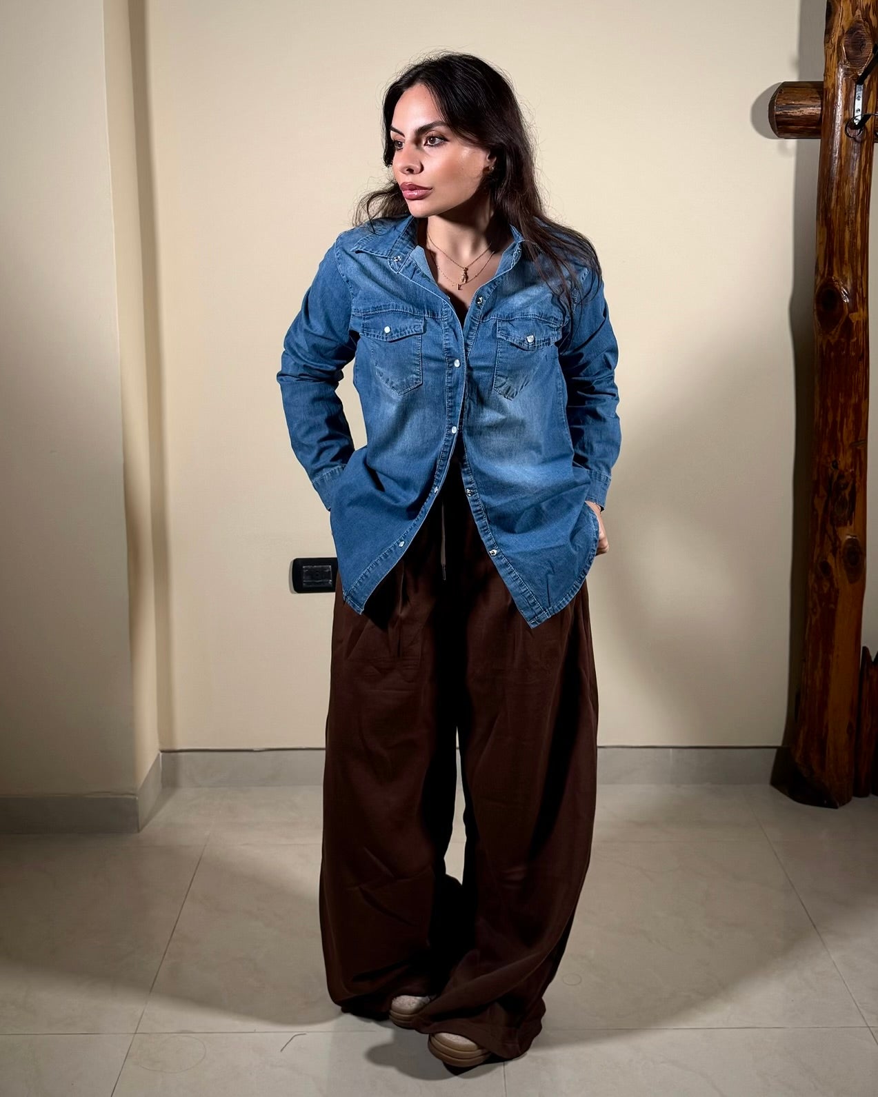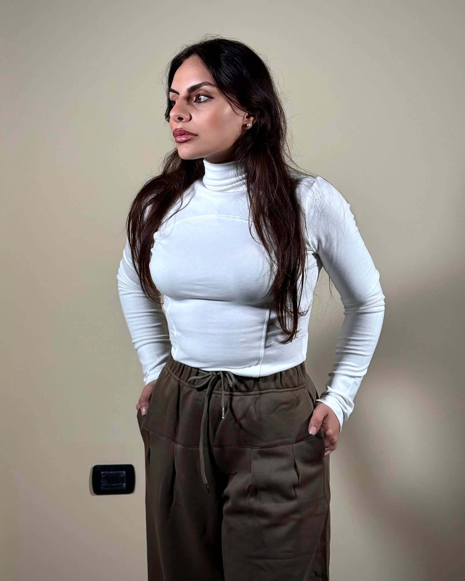 Pantalone tuta largo scende come un palazzo con elastico in vita.