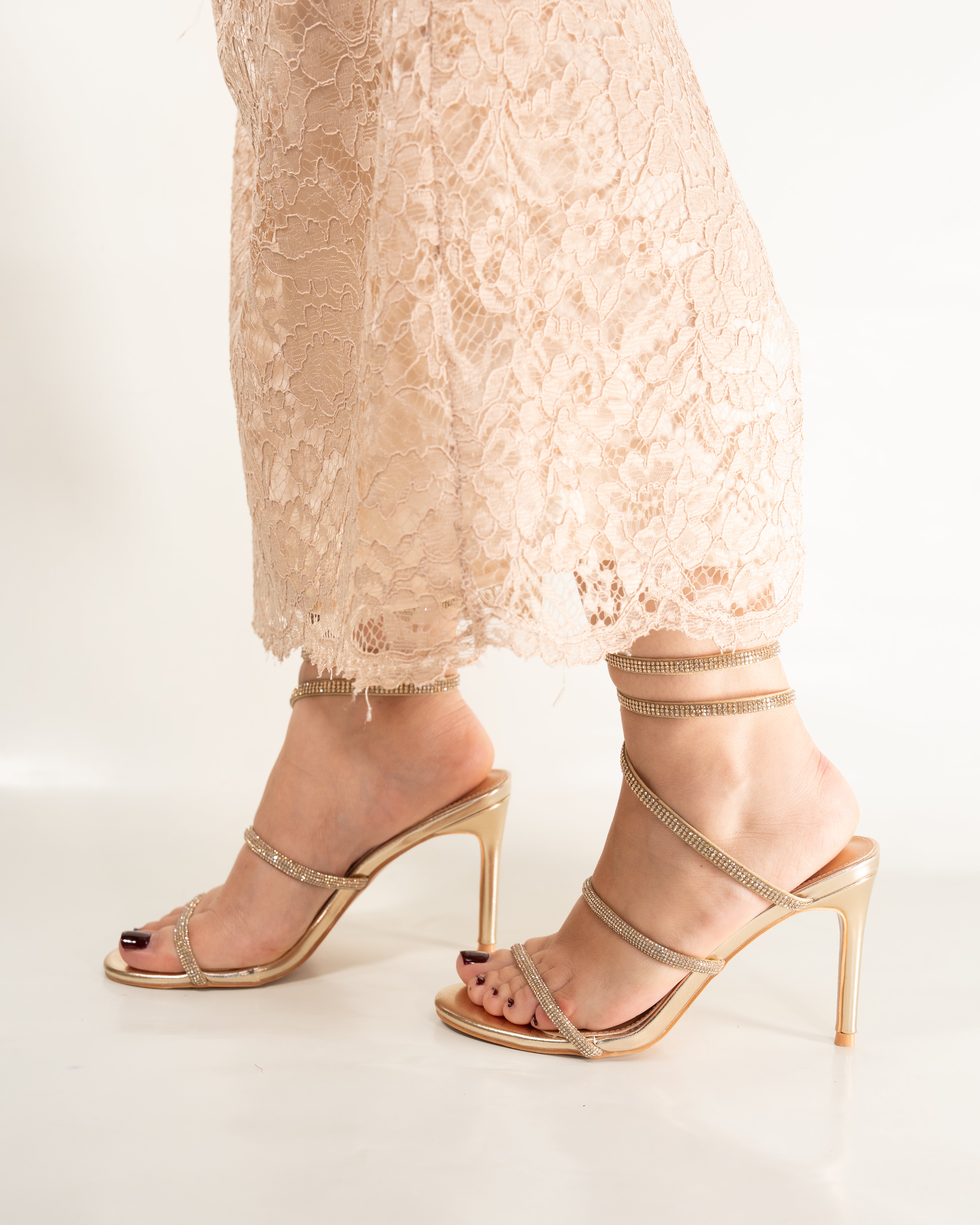Sandalo con tacco alto dal design elegante e raffinato. Realizzato in tonalità oro con sottili cinturini impreziositi da dettagli luminosi, avvolge delicatamente il piede offrendo un look femminile e sofisticato. Perfetto per cerimonie, eventi speciali o per aggiungere un tocco glamour ai tuoi outfit serali.