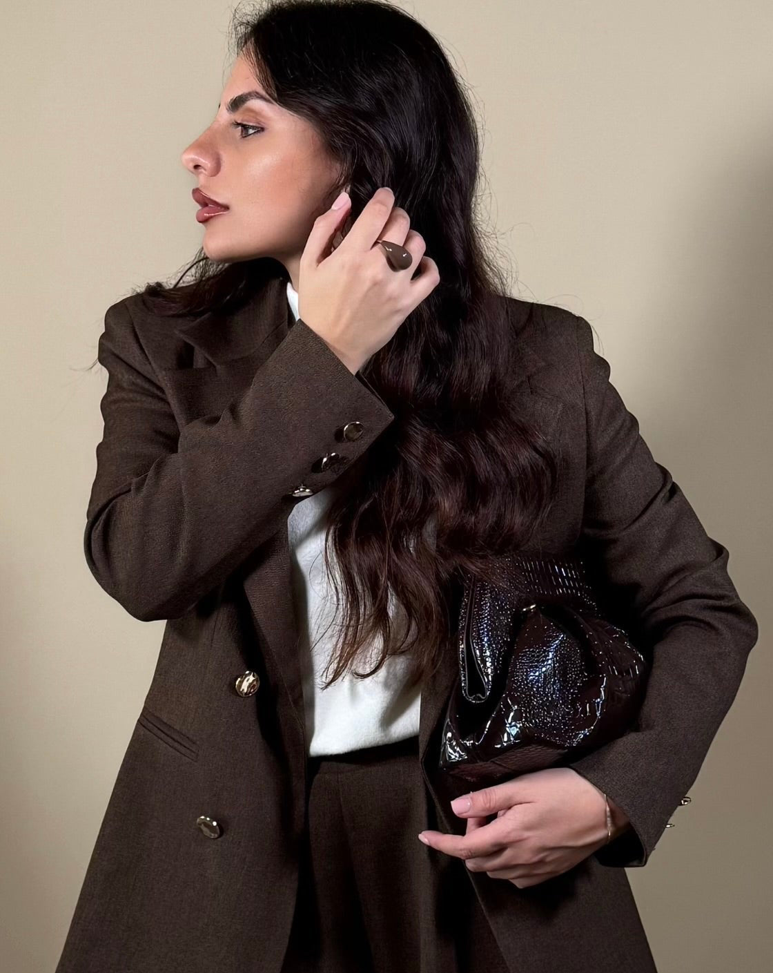 Il tailleur Moro, realizzato con tessuto mélange e rifinito con bottoni oro, è un capo di alta qualità Made in Italy. La giacca, con leggera spallina e taglio dritto, conferisce un'immagine elegante e professionale, mentre il pantalone palazzo dona fascino e stile. Perfetto per un look sofisticato e di classe.